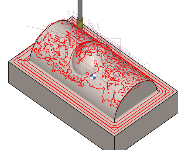 Wird verwendet, um das Restmaterial auf dem Teil zu bearbeiten, das von einem halbkugelförmigen Referenzwerkzeug (Kugelfräser) wie ein äquidistanter Schlichtzyklus übrig bleibt. Automatische Bestimmung von nicht bearbeiteten Bereichen in den inneren Ecken des Teils. |