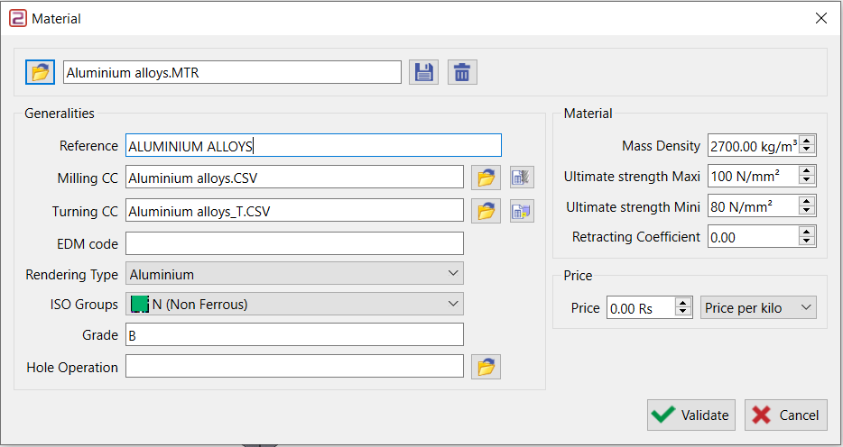 Die technologischen Parameter Ap (Z-Schritt) und Ae (Seitlicher Schritt) können für jede Qualität (Schruppen, ½ Schlichten usw.) definiert werden.