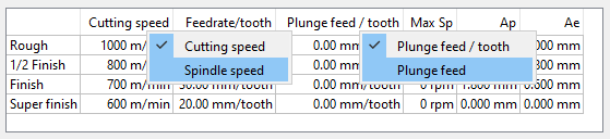 Auswahl der Einheiten: Ein Rechtsklick auf die Spaltenüberschrift ermöglicht den Wechsel von Schnittgeschwindigkeit zu Spindeldrehzahl. Gleiches gilt für die Berechnung der Vorschubgeschwindigkeit. Diese Wahl ist sehr wichtig, da sie auch bestimmt, wie die Schnittbedingungen im Falle einer Änderung berechnet werden. |