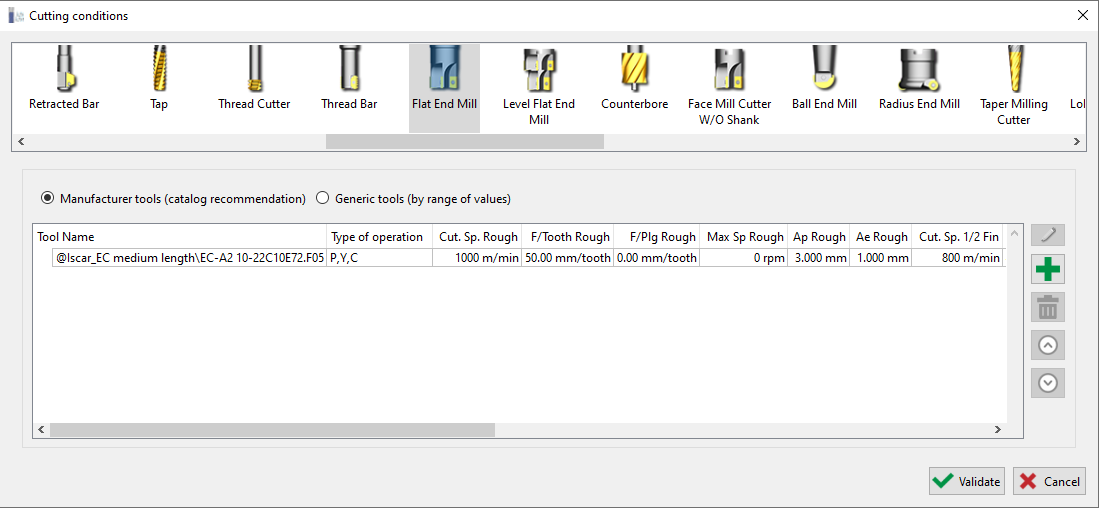 Auf der ersten Seite finden Sie die Werkzeugtabelle wie unten gezeigt. Um eine Schnittbedingungen-Datei zu erstellen, klicken Sie auf die Schaltfläche „ Hinzufügen “. Eine vollständige Liste der Werkzeugbibliotheken wird geöffnet, wo Sie haben: