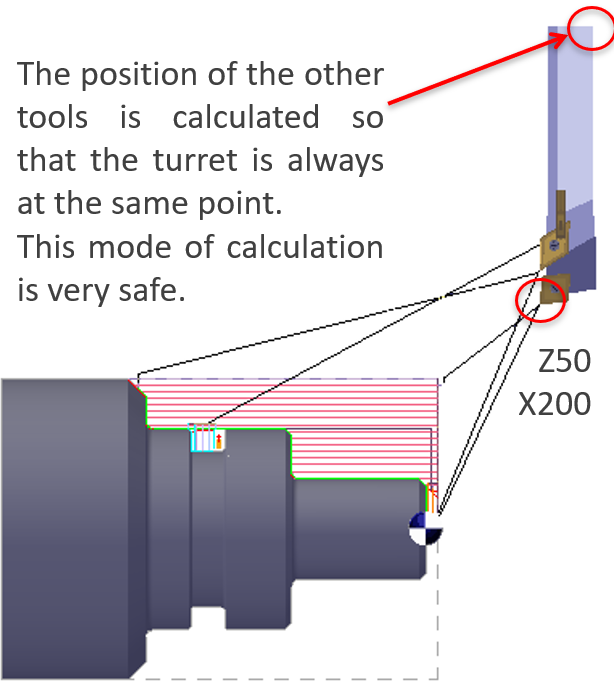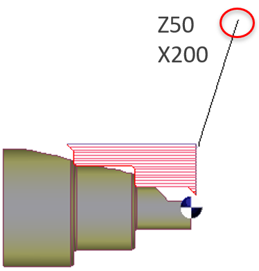 Maximale Werkzeugoption Das längste im Teil verwendete Werkzeug wird berücksichtigt. Dieses Werkzeug fährt an die Koordinaten des Evolutionspunkts heran und zieht sich zurück. |