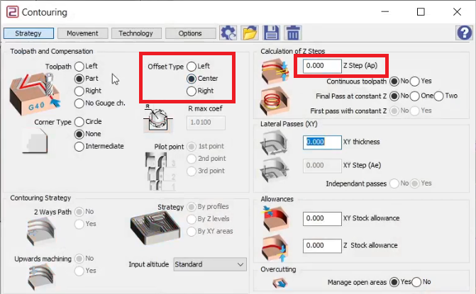 Für das Werkzeug , wählen Sie einen Kugelfräser D04 Lang. Und für das Bearbeitungszyklus , wählen Sie Konturfräsen. Wählen Sie auf der Strategie-Seite im Feld 'Korrekturtyp' die Option 'Mitte' und stellen Sie 0 mm für die Z-Zustellung (Ap) ein. |