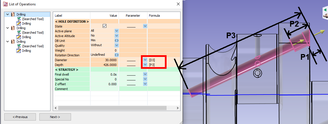 Wie bei den Liste von Operationen , sind sie von kleinerem zu größerem Durchmesser angeordnet. (D3>D2>D1) Wir können auf Weiter klicken und schließlich das Modell benennen und speichern, danach wird es auf die ausgewählte Bohrung im Technik-Reiter angewendet. |