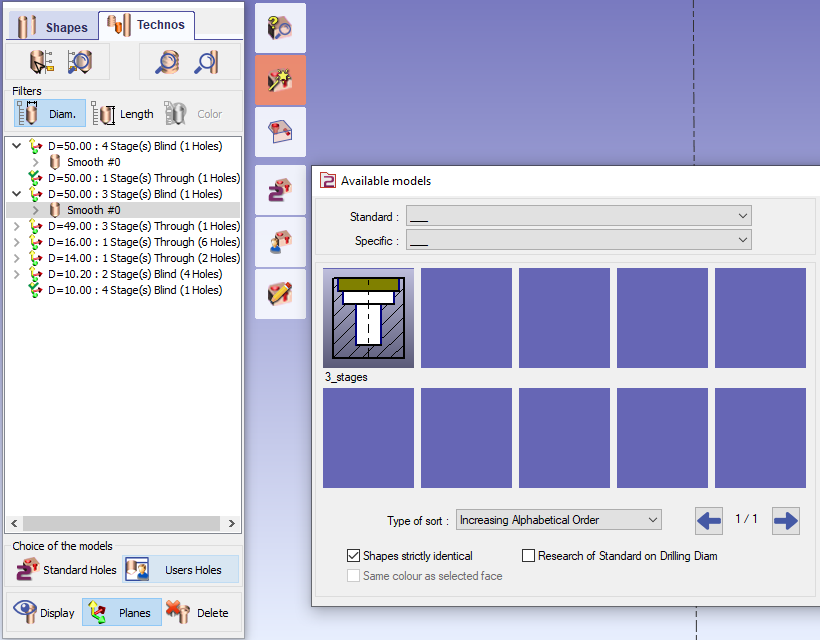 Während des Schritts Bohrungserkennung, nach Auswahl der erforderlichen Bohrung (wir wählen beispielsweise eine 3-stufige Bohrung), haben wir zwei Möglichkeiten, der Auswahl eine Benutzerbohrung zuzuweisen. |