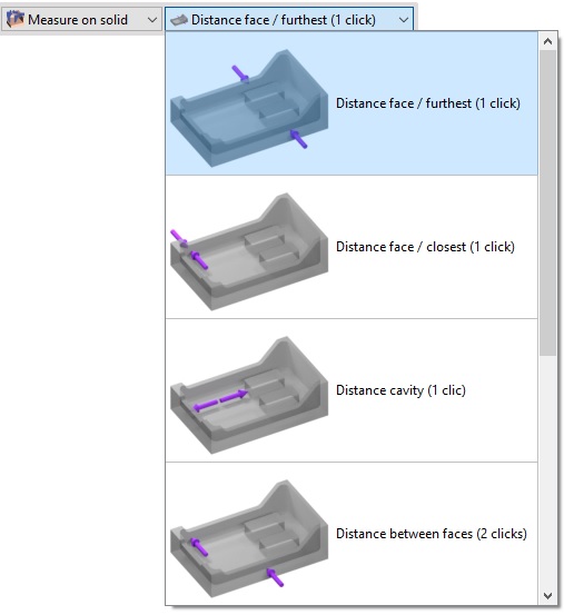 Diese Modi sind kontextabhängig: Wenn sich kein Volumen im Teil befindet, erscheint das dynamische Messen nicht im Befehl. Wenn jedoch ein oder mehrere Volumina vorhanden sind, ist das dynamische Messen der Standardmodus des Befehls.