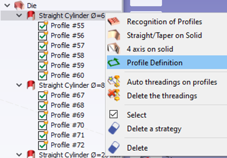 Ein Baum wird erstellt, um die Formen zu visualisieren und zu analysieren, und er bietet auch einige Befehle, wie das automatische Einfädeln auf den Profilen. Sie können die Profile im Baum deaktivieren/aktivieren, um sie auf dem Bildschirm auszublenden oder anzuzeigen. Profil Definition |