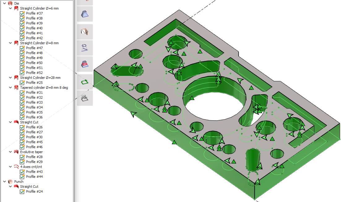 Matrizen und Stempel werden erkannt, sowie alle anderen Formen wie Zylinder, konstante und evolutive Kegel, 4-Achsen-Formen.
