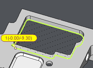 Tasche durch das Material Zuerst wird die ebene Fläche ausgewählt, die die Kante enthält. Als Nächstes wird eine Kante der zu bearbeitenden Tasche angegeben. Der Boden-Z-Wert wird dann durch Auswahl des Bodens der Wand angegeben, der sich bei Z-9,3 befindet. Das Profil wird auf dieser Höhe erstellt, kann aber bei Bedarf im Dialogfeld angepasst werden. In diesem Fall könnte die Tasche von den beiden gegenüberliegenden Seiten bearbeitet werden; alternativ könnte die Bodenhöhe geändert werden, um in einem einzigen Durchgang durchzubohren. |