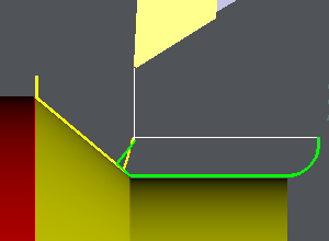 Überlappung = 1 mm Rückzug = 0,5 mm Der gelbe Pfad ist 0,5 mm kürzer, um etwas Material an der Ecke zu lassen. Der grüne Pfad schlichtet die Form, indem er den gelben Werkzeugweg überlappt. |