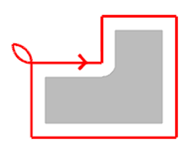 Wenn die Profilrichtung und die Werkzeugwegrichtung nicht übereinstimmen gemäß der Volumenform , GO2cam automatisch invertiert die Profilrichtung . Im Bild rechts ist das Profil gegen den Uhrzeigersinn und das Werkzeug ist auf der linke Seite des Volumens : GO2cam invertiert automatisch die Profilrichtung, um eine Bearbeitung im Inneren des Werkstücks zu vermeiden. |