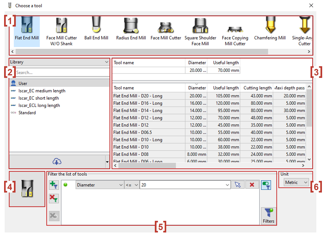 To select your tool, you can make a Filtern Sie die Werkzeugliste with several criteria. We also offer an automatic pre selection of tool according to the shape of the pocket, this is called Tool Finder. Sortierung in der Bibliothek for more info. |