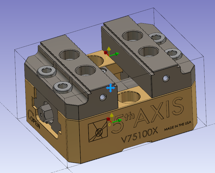 Das Achsensystem 1 ist der Punkt, den Sie steuern können, wenn Sie die Position des Schraubstocks auf dem Teil festlegen. Bei einem symmetrischen Schraubstock sollte es zwischen den beiden Backen zentriert sein.