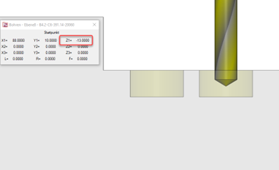 Pour le cas où un Chanfrein est défini et pré-usinée pour le lamage, le calcul de la distance de sécurité prend en compte le chanfrein résultant en la distance de sécurité pour le foret étant légèrement plus profonde. Par exemple à Z -13.65 plutôt que Z -13 dans l'exemple. Le changement entre les cycles de perçage s'effectue toujours à Z -8, garantissant ainsi un flux sûr.