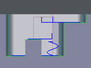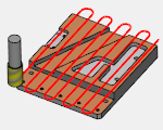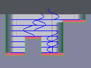 L'incrément de passe est respecté quelle que soit la forme de la poche. Si le haut des îlots et le fond des poches ne correspondent pas à une valeur de passe, ils ne sont pas usinés. Voir exemple ci-dessous, les zones rouges ne sont pas usinées.
