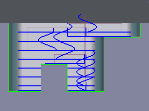La passe est ajustée : l'incrément de passe est ajusté pour rendre possible l'usinage du haut des îlots et du fond de la poche et des sous poches. |