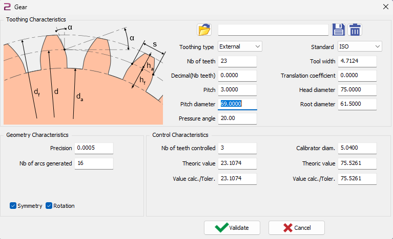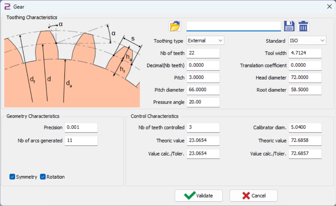 Pour les trois champs de droite vous définissez un diamètre calibreur. Il sera positionné entre deux dents. Après positionnement nous mesurerons la distance entre calibreurs opposés.