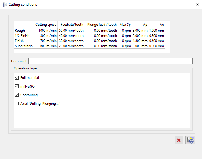Ici, nous pouvons définir les conditions de coupe pour un outil spécifique. Les Conditions de coupe peuvent être défini pour chaque outil . De plus, un même outil peut être défini plusieurs fois car vous choisissez le type d'application pour l'outil : contournage, poche, millyuGO, etc.