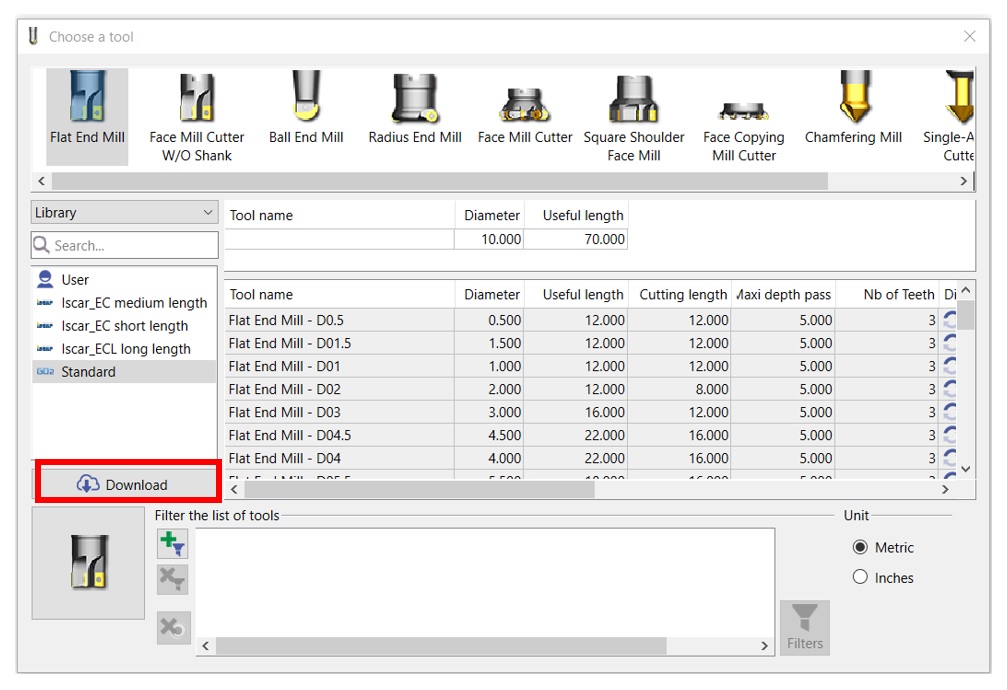 Vous pouvez également téléchargement depuis l'environnement d'usinage spécifique sur lequel vous travaillez. La boîte de dialogue qui apparaît est celle qui s'affiche lors de la sélection d'un outil. En en cliquant sur Télécharger , un onglet similaire s'ouvrira mais cette fois les outils seront plus spécifiques. Par exemple, si une fraise 2 tailles est sélectionnée et que le bouton de téléchargement est cliqué, vous trouverez une liste de fraises 2 tailles fournies par plusieurs fabricants d'outils. |