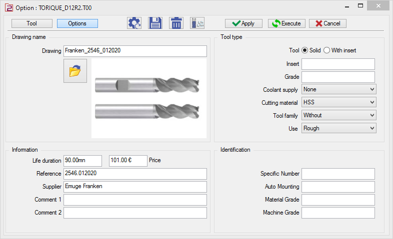 Afin de calculer correctement le coût de l'outil, nous avons besoin de 2 informations : Le coût d'achat d'un outil, Le durée de vie de l'outil, qui donnera le nombre d'outils utilisés pour la production de la pièce.