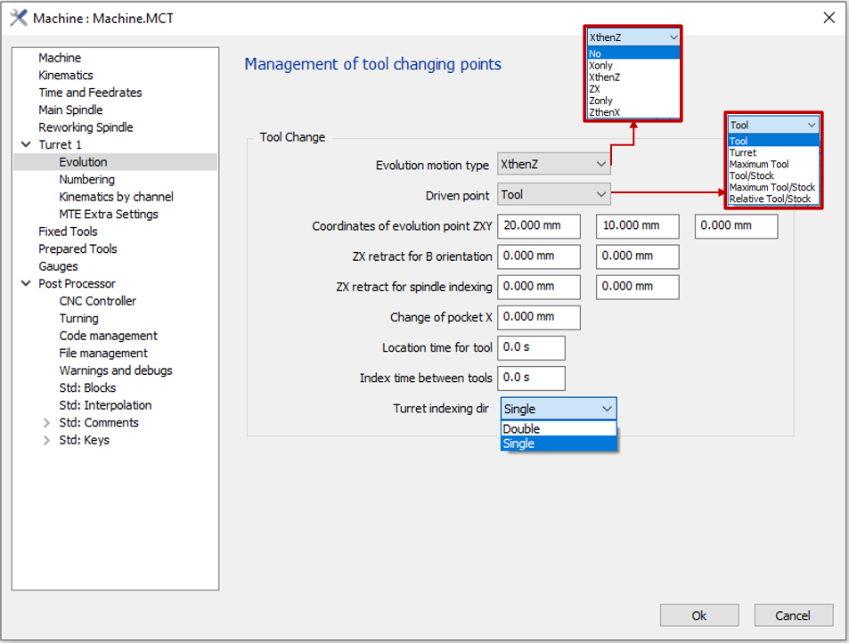 Le Point d'évolution est le point de changement d'outil. Il est accessible dans la fenêtre d'édition de la machine qui permet diverses configurations pour la gestion des points de changement d'outil :