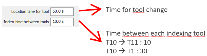 Exemple : 1 changement d'outil entre le cycle 2 et le cycle 3 = 50 s 3 indexations entre T1 et T10 = 3 x 10 s = 30 s Total = 80 sec.