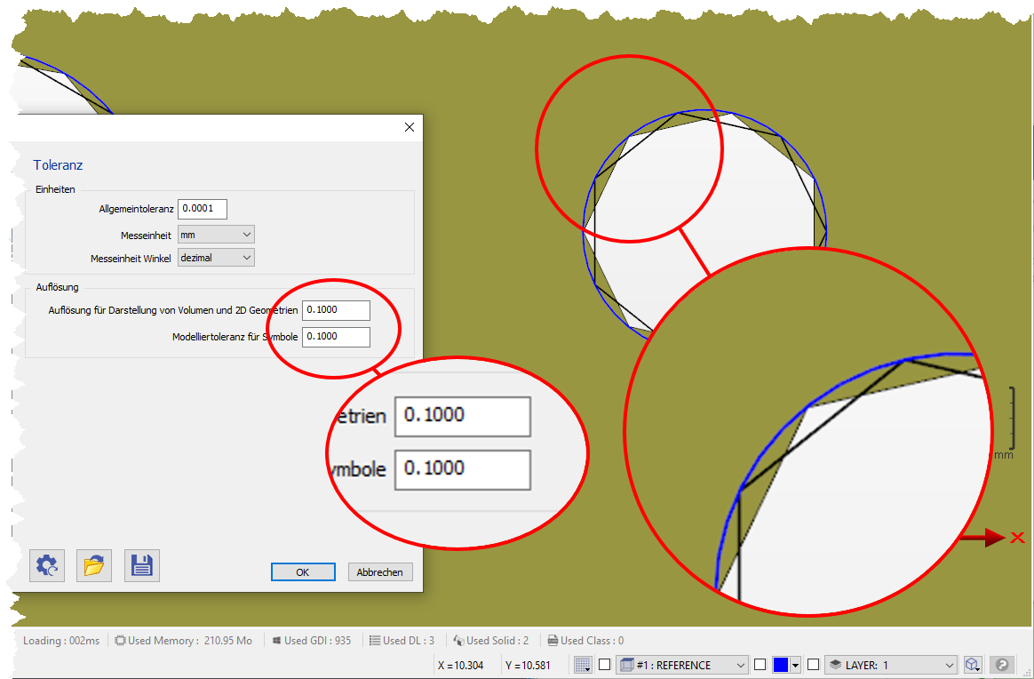 Ici, nous avons un composant avec une tolérance de 0.1 mm est affiché sur la base de la tolérance d'affichage. Le cercle 2D bleu est inclus en comparaison, de sorte que le calcul de l'affichage du modèle solide sous forme d'approximation du cercle par segments de droite est très bien reconnaissable. |