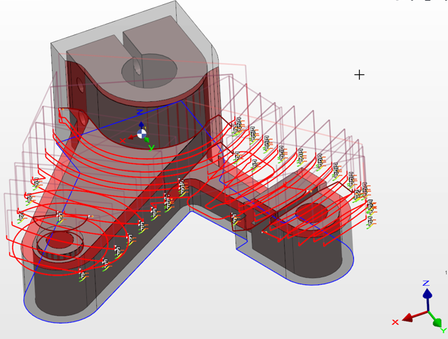 Vous pouvez voir très clairement que GO2cam calcule les parcours outils en respectant la forme du brut existant et évite ainsi l'usinage dans le vide. |