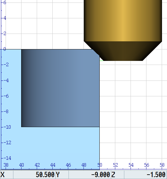 Dans la simulation, l'outil est affiché correctement, mais toujours avec une pointe théorique (diamètre inférieur 0). Le diamètre (supérieur) entré dans la table d'outils peut être utilisé pour la correction. |