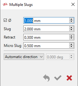 Donnez la localisation du point en entrant ses coordonnées ou en cliquant sur un point à l'écran. Si besoin (cocher la case), entrez le diamètre de la multi attache. Les points affichés montrent un 'M' pour Multiple. Sur l'image ci-dessous, les multi attaches sont réglées en vert tandis que le point d'enfilage est bleu. Attention : définir un point d'enfilage est toujours nécessaire et obligatoire. Dans le processus de stratégie, l'usinage sera opéré en 3 zones, selon un point d'enfilage et 2 multi attaches. |