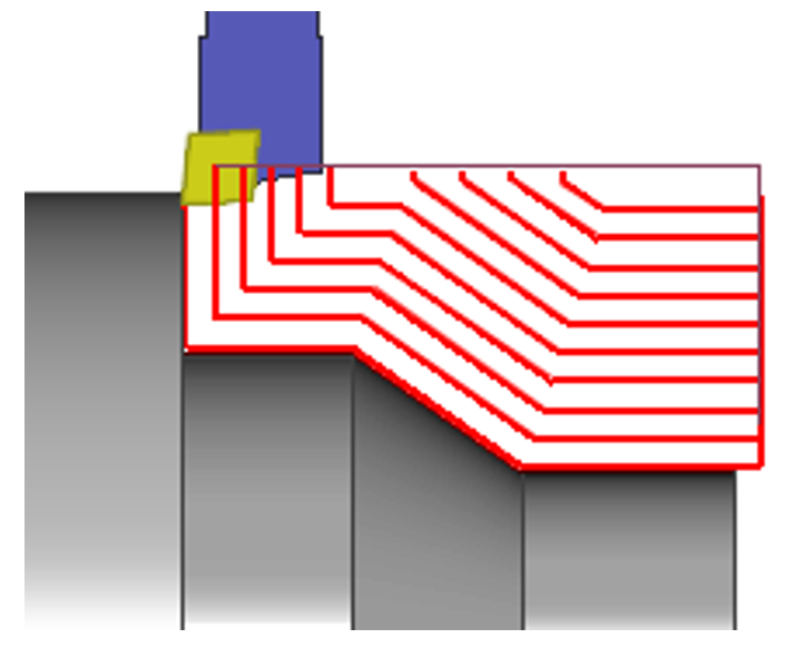 Ce cycle est une opération polyvalente ; il gère le trajet extérieur droit, mais aussi le dressage, l'alésage intérieur et même l'usinage de dressage arrière. Les passes restent parallèles au profil sélectionné alors que le cycle Ebauche génère un trajet parallèle à l'axe. |