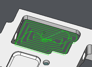 Poche traversante Tout d'abord, la face plane contenant l'arête est sélectionnée. Ensuite, une arête de la poche à usiner est indiquée. La valeur Z fond est ensuite spécifiée en sélectionnant le bas de la paroi, qui se trouve à Z-9.3. Le profil est créé à cette altitude, bien qu'il puisse être ajusté dans la boîte de dialogue si désiré. Dans ce cas, la poche pourrait être usinée depuis les deux côtés opposés ; alternativement, l'altitude du fond pourrait être modifiée pour usiner en une seule passe. |