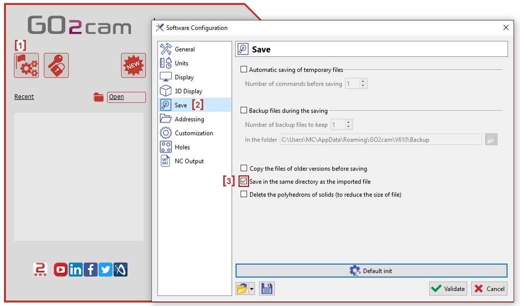 An un processus automatique de sauvegarde est possible dans GO2cam. Vous pouvez définir la fréquence de sauvegarde dans la Logiciel Configuration , dans la page Enregistrer puis Sauvegarde automatique des fichiers temporaires . Pour récupérer un fichier déjà sauvegardé, en cas de crash du logiciel par exemple, allez dans le menu Fichier , puis choisissez Récupérer fichier temporaire . |