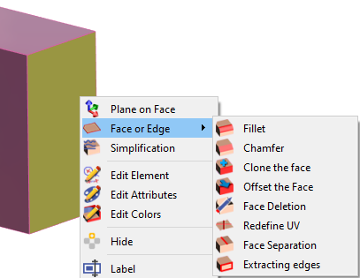 Vous pouvez éditer le solide en effectuant un clic droit sur la face ou l'arête et vous disposez de plusieurs commandes : Plan sur face : permet de créer un plan de travail à partir de la face sélectionnée. Face ou arête : il y a une liste de commandes pour modifier l'arête ou la face sélectionnée. |