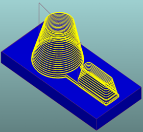 Le cycle de finition en spirale, permet de réaliser une finition avec un pas constant avec une descente en hélice sur toute la pièce sans remontée, les différentes zones de la pièce sont détectées et gérées automatiquement et les premières et dernières passes de chaque zone sont constantes. |