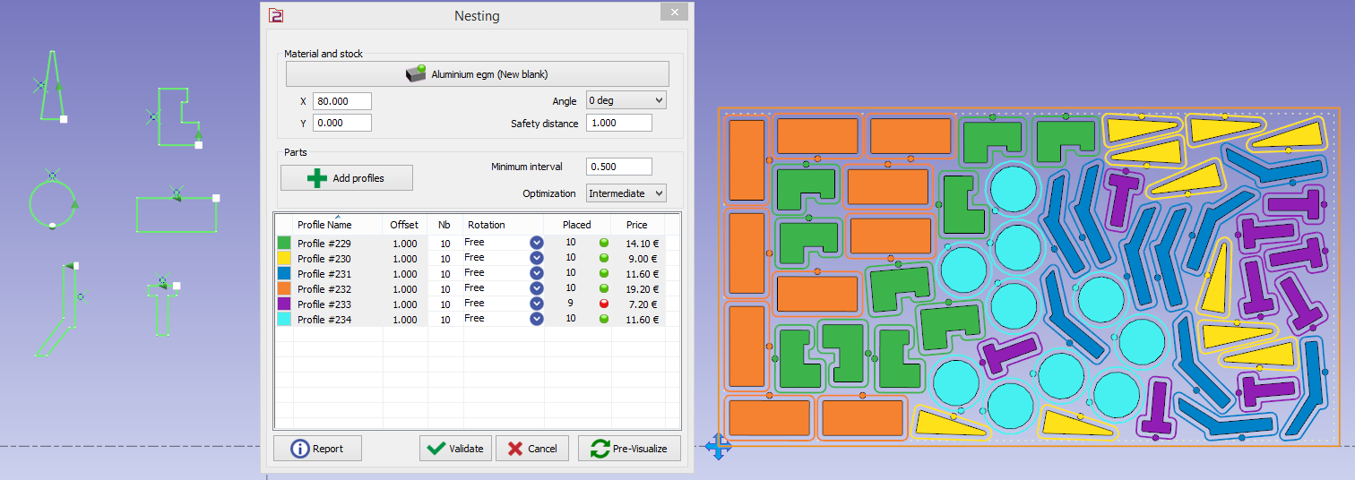 L'imbrication est un module optionnel qui permet d' optimiser le positionnement de formes multiples dans un brut. Elle est disponible en érosion fil dans le menu Conception.
