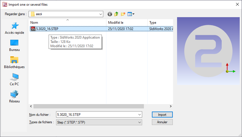 Sélectionnez l'option d'import à appliquer au solide. Cliquez sur “Appliquer”