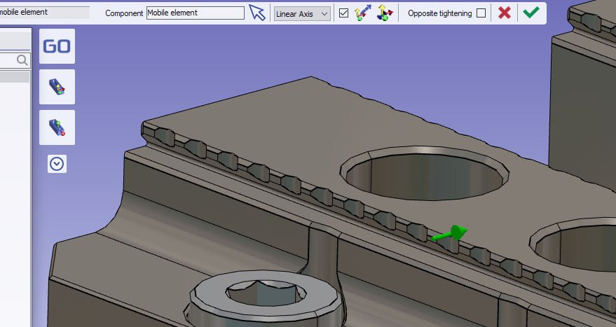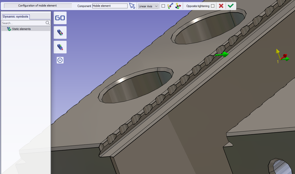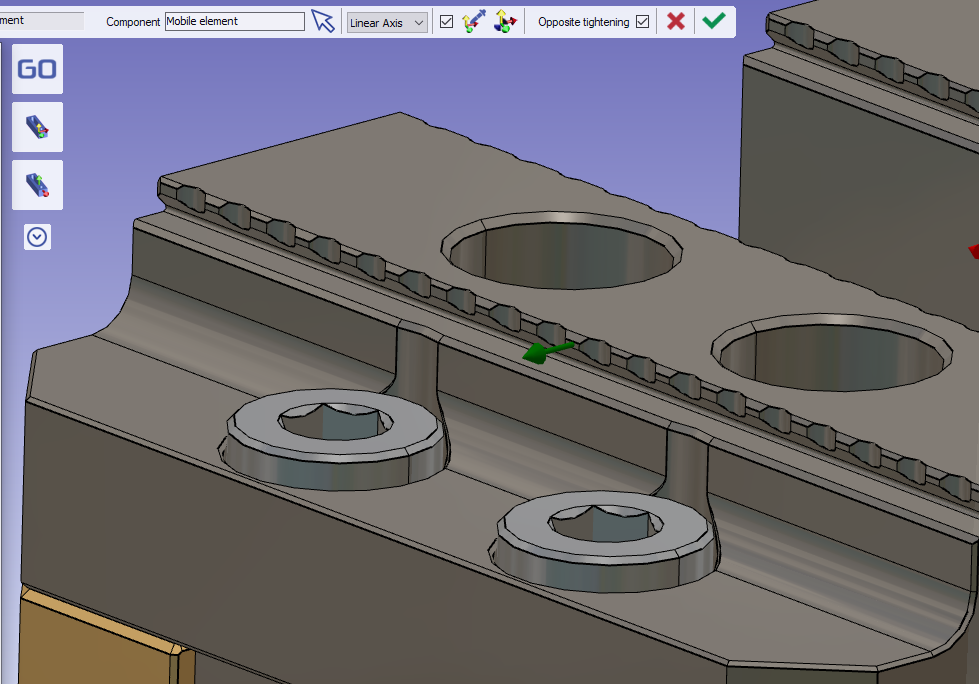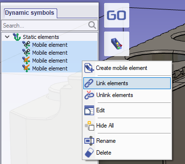 Pour synchroniser le mouvement des deux mors, sélectionnez les deux dans l'arbre de gauche. Faites un clic droit pour afficher le menu contextuel puis « Associer éléments ».