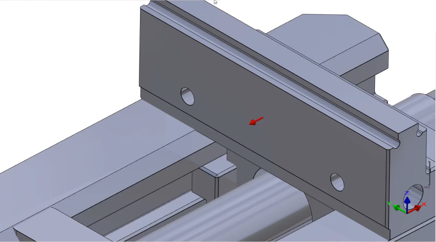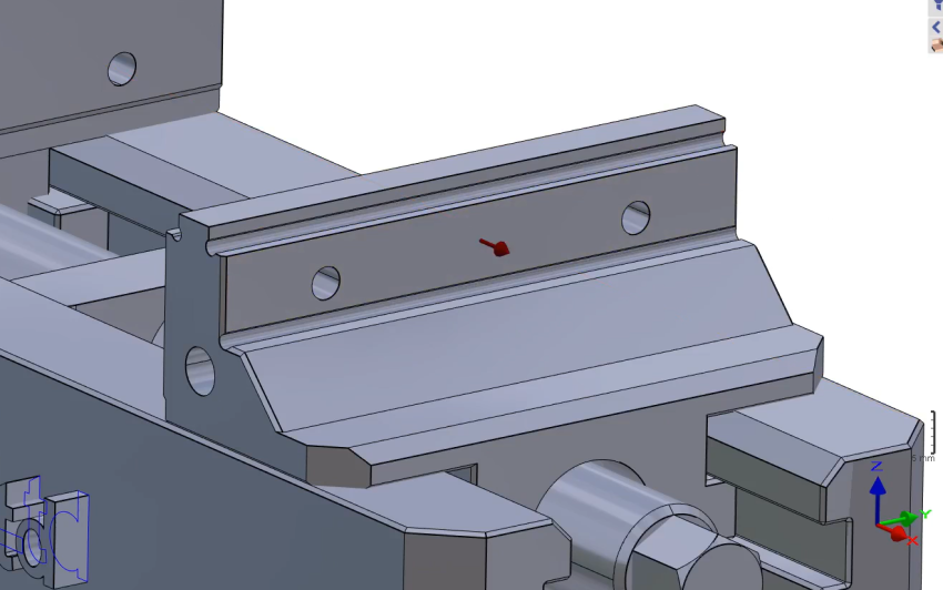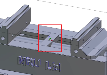 Répétez le processus pour la deuxième mâchoire. D'abord, cliquez sur la commande 'Vecteurs composant' pour créer le système d'axes. Puis sélectionnez l'élément mobile comme indiqué. |