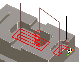 Pour les poches ouvertes, la première plongée (en noir) est toujours extérieur de la matière . Ensuite, la seconde poche est réalisée avec une plongée en hélice. |