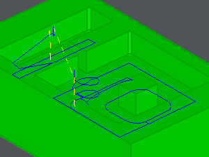 La définition d'un rayon d'hélice minimum pour la plongée est telle que cette valeur ne peut être supérieure à la valeur du rayon de l'outil. L'outil plonge en hélice là où c'est possible, selon le rayon défini et la zone à usiner. Si ce n'est pas possible, comme montré dans l'exemple, l'outil effectue une plongée en rampe. |