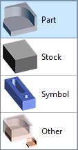 Hücre 4 olasılık sunar: Parça : işlenecek katı model, Stok : seçilen katı modeller otomatik olarak işleme stoğuna dönüştürülür, Sembol : iş tutma ve sıkıştırma elemanlarının seçimi, Diğer : tutulacak ancak diğer 3 aileden olmayan katı model. Otomatik stok oluşturulurken, bu eleman sınırlayıcı kutunun hesaplanmasında dikkate alınmayacaktır. Örneğin, bazen katı model olarak tasarlanan orijin olabilir. Seçim, muhtemelen parça ve stok için sıkça olduğu gibi katı modelden katı modele yapılabilir. Ancak birden çok seçimi yapıp açılır menüye erişerek öğe türünü seçmek de mümkündür. Bir sonraki sayfada daha fazla açıklama okuyabilirsiniz. düğmeleri, |