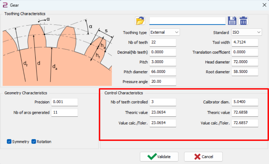 Sağdaki üç alan için bir kalibratör çapı tanımlarsınız. Bu, iki diş arasına yerleştirileceği anlamına gelir. Yerleştirmeden sonra karşılıklı kalibratörler arasındaki mesafeyi ölçeceğiz.