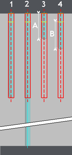 Stok (durum 2): İşleme malzemeden yapılır. Manuel / Eleman (durum 3): Derinlik alanına (A değeri) manuel olarak bir değer girilmelidir. Derinlik, elemana (delik veya daire) Z konumlandırmasına göre tanımlanır. Manuel / Stok (durum 4): Derinlik alanına (B değeri) manuel olarak bir değer girilmelidir. Derinlik, stok değerine göre tanımlanır. Ön delme işlemi tanımlandığı için, derinlik şuradan hesaplanır: önceden delinmiş deliğin alt kısmı . |