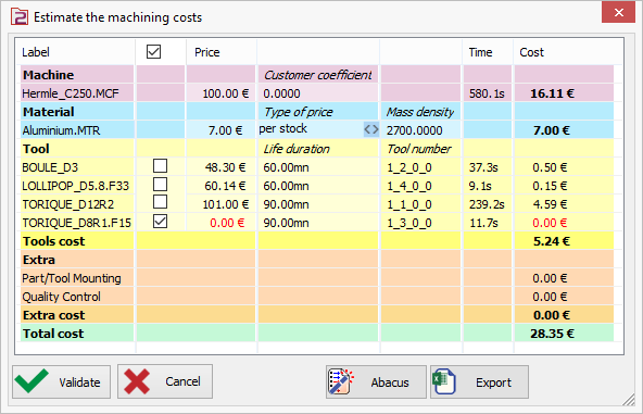 Her takım için onay kutusu, bir Abaküs dosyasından yaklaşık bir fiyat verme olanağı sunar. Bu abaküs, Cost.xml klasöründeki Mat dosyasıdır. Bu dosyayı kendi değerlerinizle özelleştirebilirsiniz. Fiyatı tanımlanmamış takım için kutuyu işaretleyin, ardından alttaki 'Abaküs' düğmesine tıklayın. Takıma bir fiyat verilecektir, bu satır İtalik . |