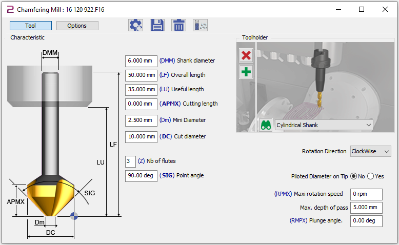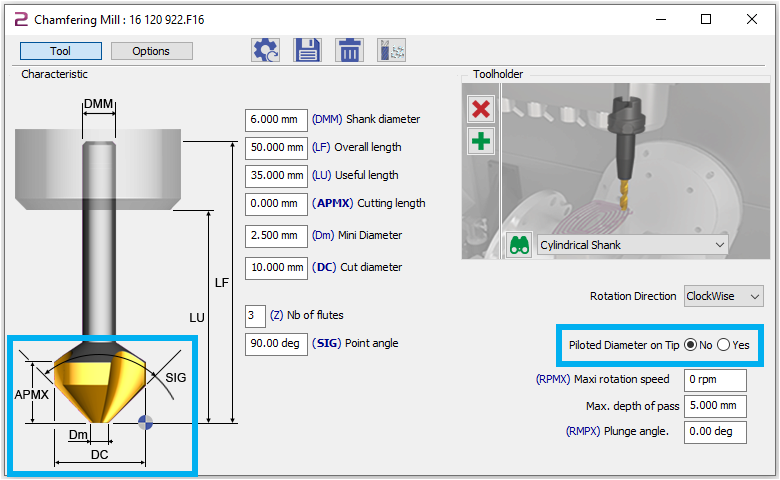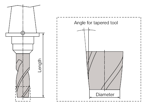 Takım türleri arasında kesik koni kesicisi (tip 155) bulunur, ancak bu yalnızca çapları ve açıları belirtme imkanı sunar. Bir ikinci çap veya kesme kenarı uzunluğu parametre olarak sunulmaz. |