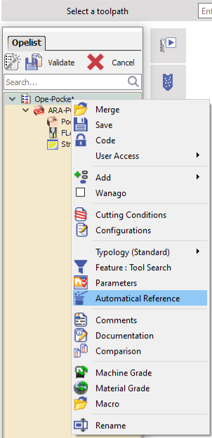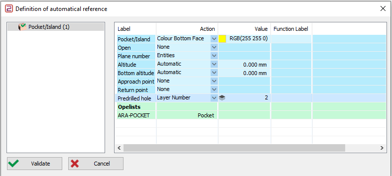 Otomatik referansı tanımlamak için cep çevrimi için şunları ayarlayın: Eylem > Renk Otomatik Yüzey Değer > Varsayılan olarak bırakın İşlev etiketi > Renk olarak yazın Opelist'i doğrulayın ve kaydedin. |