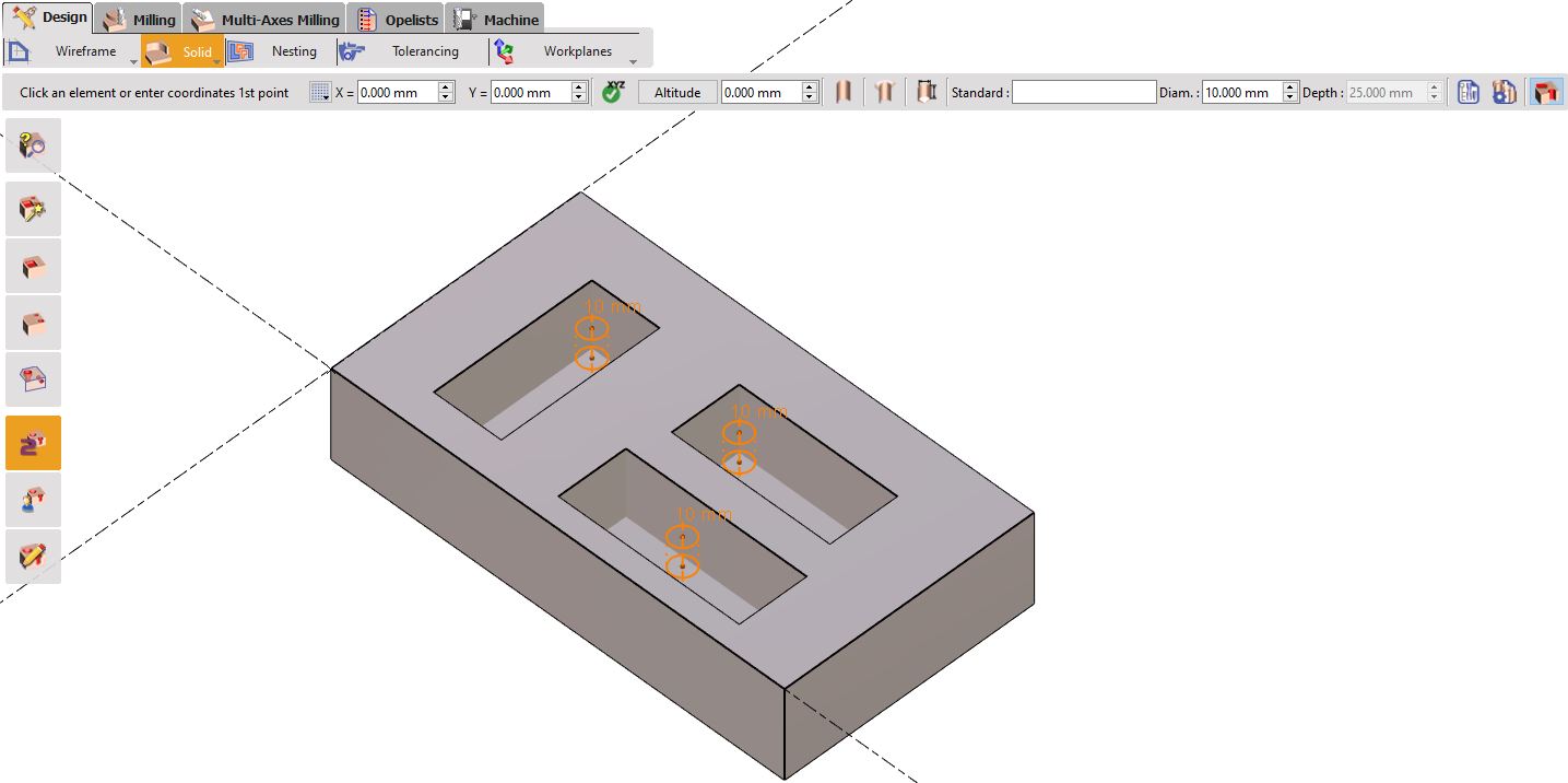 1/ Önceden delinmiş deliğin manuel olarak oluşturulması. İlk adım, Tasarım sekmesinde standart bir delik tanımlamayı veya basitçe tercih edilen konuma bir daire tasarlamayı gerektirir.