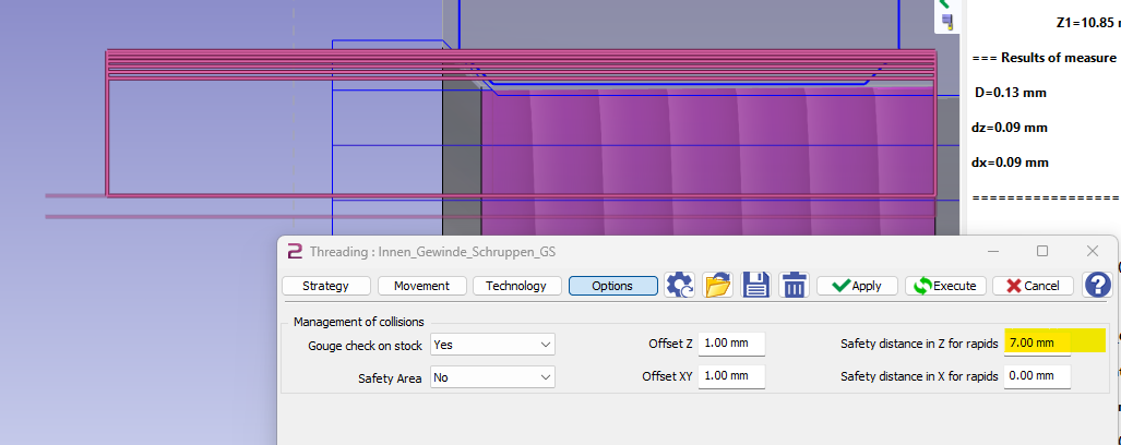 Bu nedenle, istenen toplam derinliğe ve kaba paso sayısına göre ilk ve son giriş seçilmelidir (ve tersi). Kullanılan post-işlemci, vida işlemesini bir makine çevrimi olarak (örneğin SIEMENS için CYCLE97 veya Fanuc için G76) çıktı veriyorsa, temel parametreler vida adımı, toplam derinlik ve (kaba) paso sayısıdır. Bu durumda, NC kodu her durumda doğrudur. Parametrelerin yanlış bir kombinasyonu, vida işlemesinin yanlış simülasyonuna yol açabilir. Kullanılan post-işlemci makine çevrimi değil, G33 ile bireysel kesimleri çıktı veriyorsa, bu durumda da NC kodu yanlıştır! |