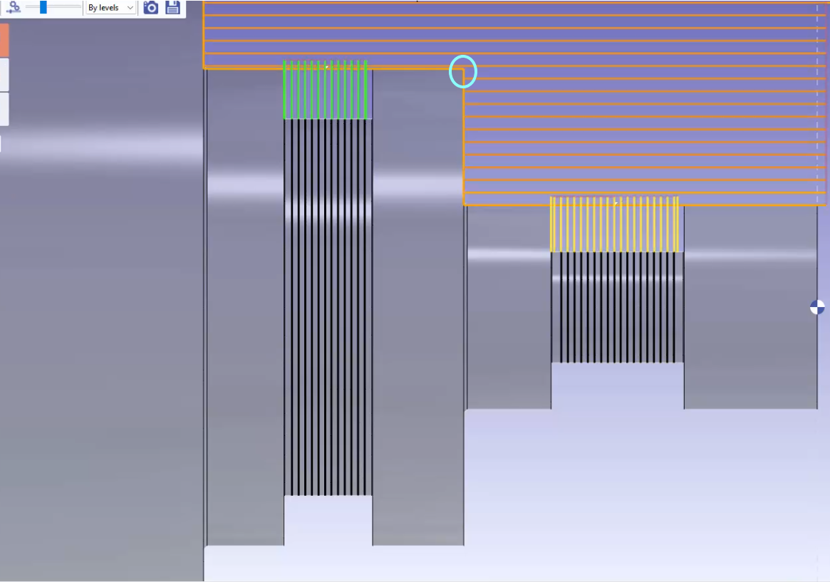Örneğin bu örnekte, Doğrudan_1 kanal çevrimini (yeşil takım yolları) belirtilen noktada (önceki fotoğrafta daire içine alınmış) kaba işleme çevrimi ile senkronize etmek istiyoruz. Amaç, kaba işleme çevrimi daire içine alınmış noktaya ulaştığında kanal çevrimini başlatmaktır. |