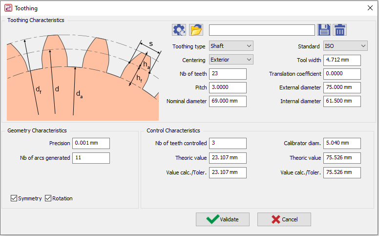 ISO (NF E 22-141) ve AGMA (Amerikan) Standartlarına göre düz kenarlı evolvent daire kamalar oluşturma. |